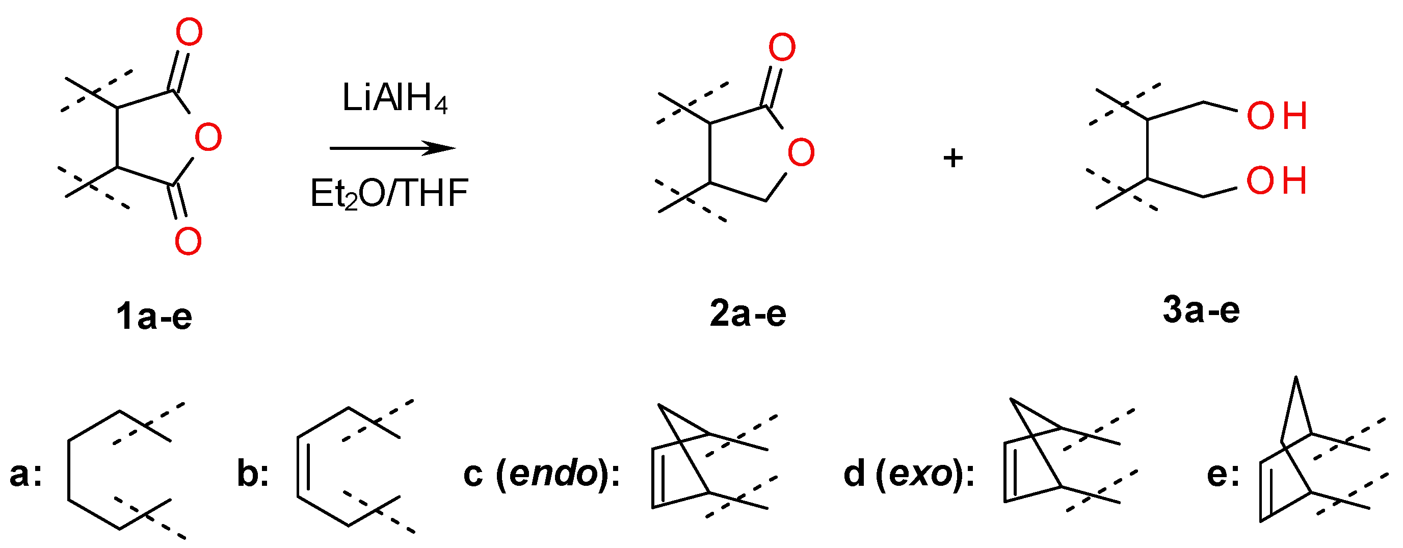 Meso diols 3a–e, the substrates in the biotransformations carried out, as well as racemic lactones 2a–e, the products of those biotransformations, were obtained from commercially available anhydrides 1a–d by the reduction method with lithium aluminum hydride (Scheme 1). Among synthesized substrates were monocyclic diols with a cyclohexane ring (3a) and the unsaturated analog (3b), as well as bicyclic diols with the structure of [2.2.1] (3c–d) and [2.2.2] (3e).