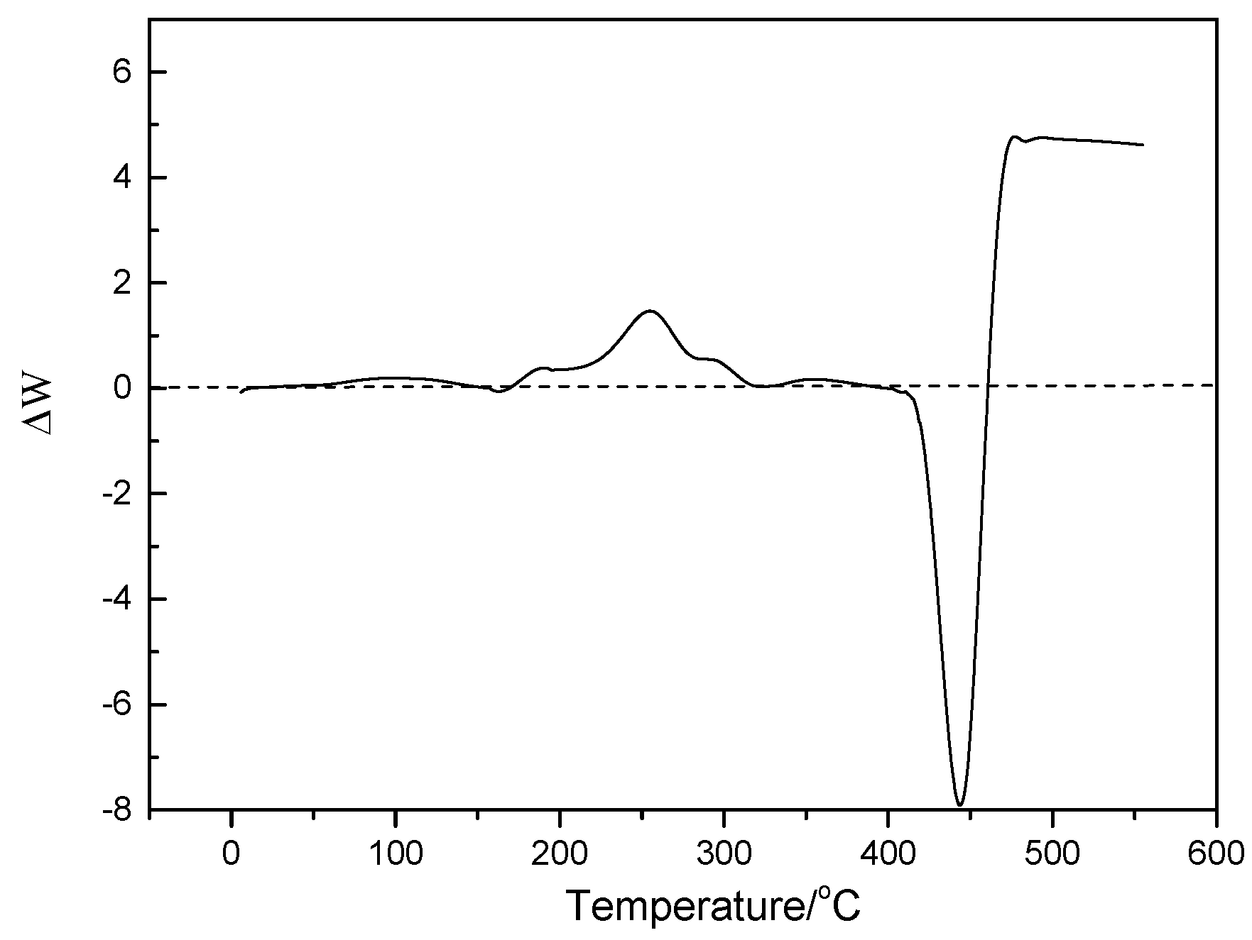 First, ΔW is defined as an interactive effect parameter and is formulated by Equation (4). Figure 1 shows the variation of ΔW with temperature; ΔW was less than 1% below 180 °C because PP and cotton straw were not decomposed below 180 °C, and there was no synergistic effect. We saw that ΔW was positive at the range of 180–320 °C, which was attributed to the fact that PP was softened at about 180 °C and further heated to produce a plastic state that inhibited the evolution of volatile matter in the cotton straw. Then, ΔW was negative at the range of 380–480 °C. In this stage, cotton straw and PP began to decompose simultaneously in the temperature range, and cotton straw decomposed to form a radical, which can promote PP to degrade, and the weight loss rate of the cotton straw/PP mixture was greater than the weighted average of one obtained from the separate pyrolysis of the sample. The result indicated there was a synergistic effect in the co-pyrolysis of the cotton straw/PP mixture.
