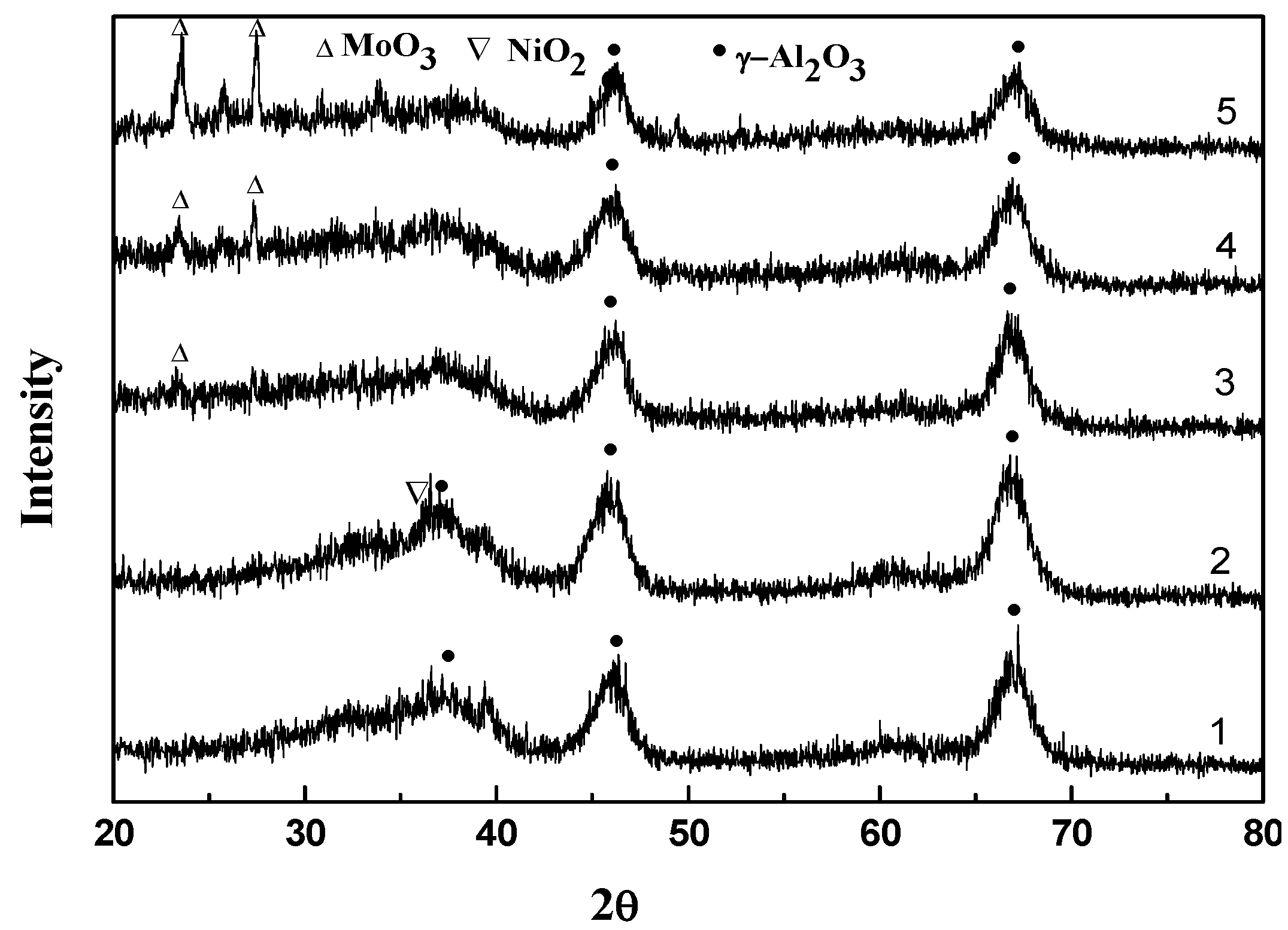The XRD pattern of the catalyst: (1) γ-Al2O3, (2) NiO-8 wt. %/γ-Al2O3, (3) NiO-5.4 wt. %/γ-Al2O3 (MoO3-2.6 wt. %), (4) NiO-2.6 wt. %/γ-Al2O3 (MoO3-5.4 wt. %), (5) MoO3-8 wt. % /γ-Al2O3.