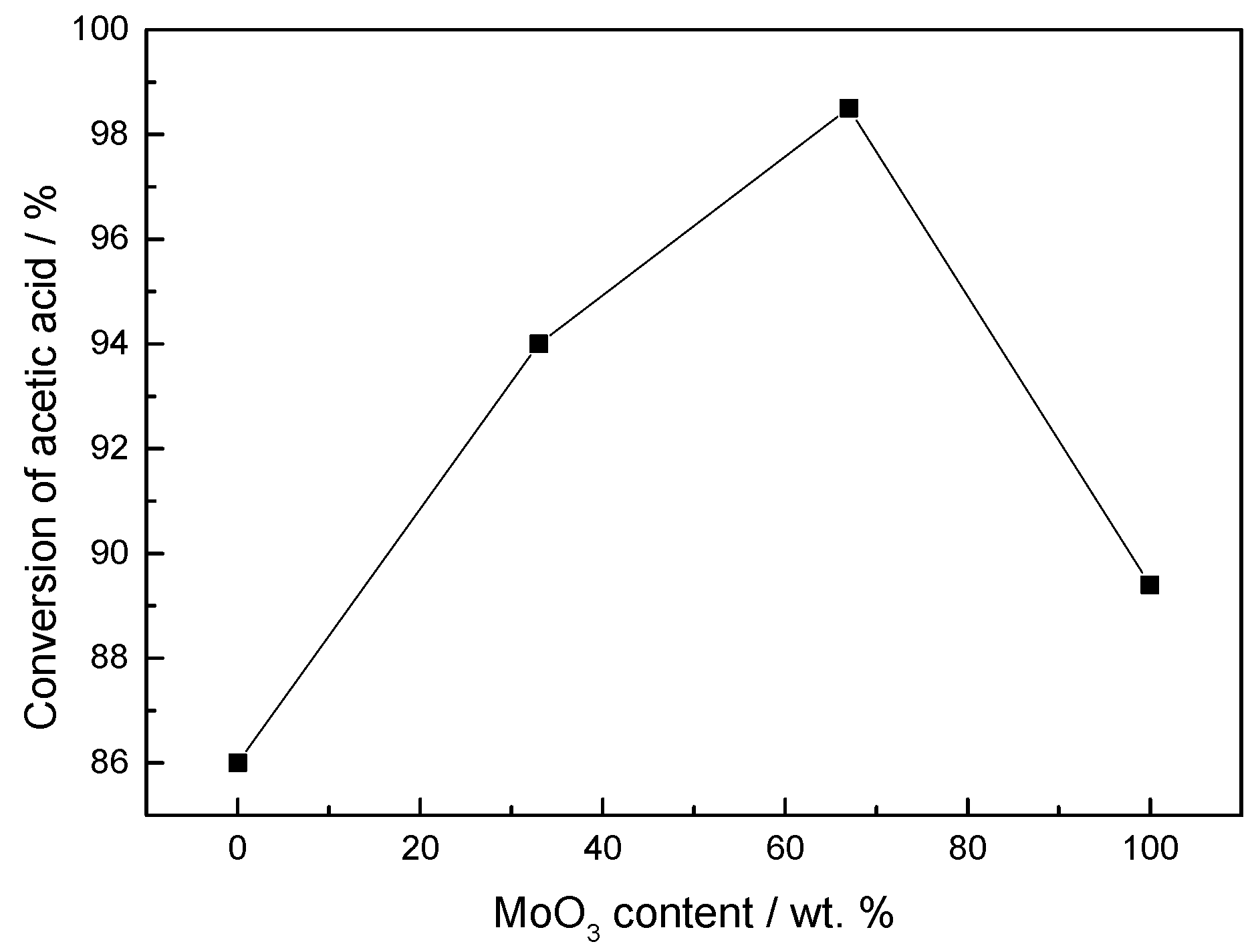 Effect of MoO3 content on the conversion of acetic acid. Reaction conditions: P = 3 MPa, WHSV = 1.5 h−1, H2/feedstock = 400.
