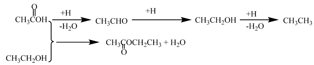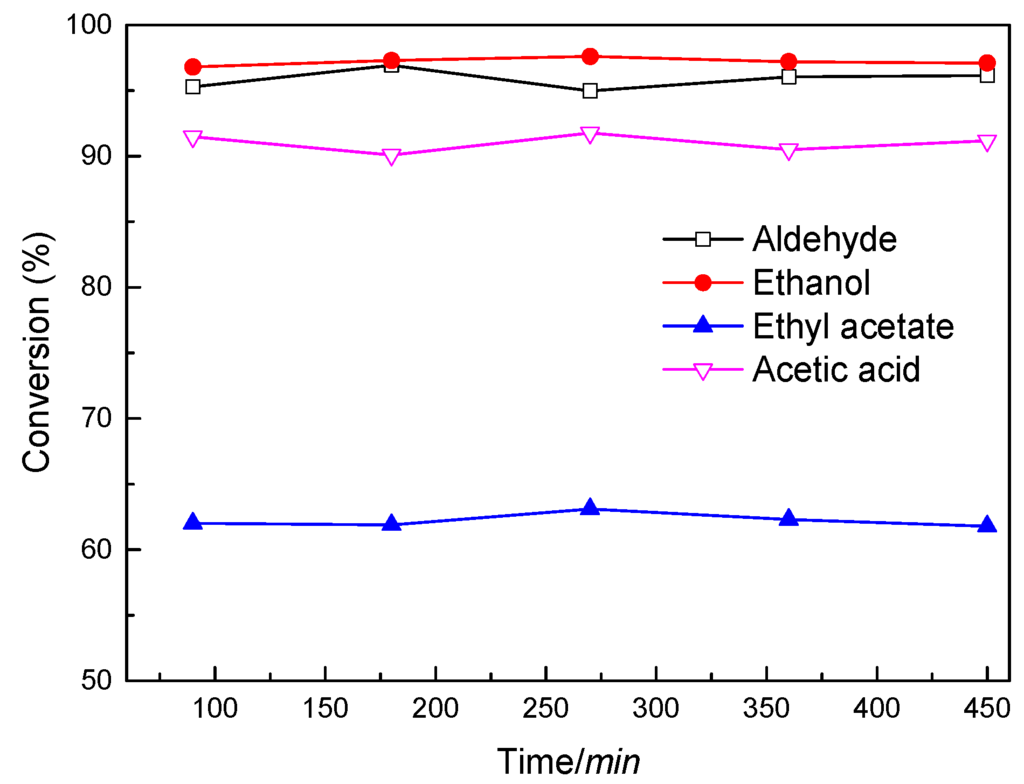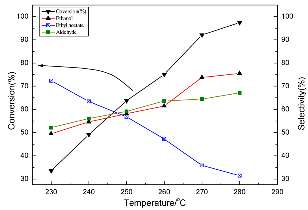 The catalyst was tested at the range of 230~280 °C and 3 MPa of hydrogen pressure for 2 h. The conversion of acetic acid was neglected over the Al2O3 catalyst at 280 °C and 3 MPa for 2 h. The conversion of acetic acid increased with temperature over the Ni-Mo/γ-Al2O3 catalyst, and a conversion of 98% was obtained at 280 °C, which may be considered a complete conversion. Acetic acid was converted via two paths: (1) hydrogenation and (2) esterification. A main reaction profile is given in Scheme 1. Product distribution also is shown in Figure 4. Selectivity of ethyl acetate decreased with the increase of temperature, and that of ethanol and aldehyde were contrary to that of ethyl acetate. Methane, CO, and CO2 were detected in the outlet stream above 280 °C. The result suggests that decarboxylation of acetic acid occurs under this condition.
