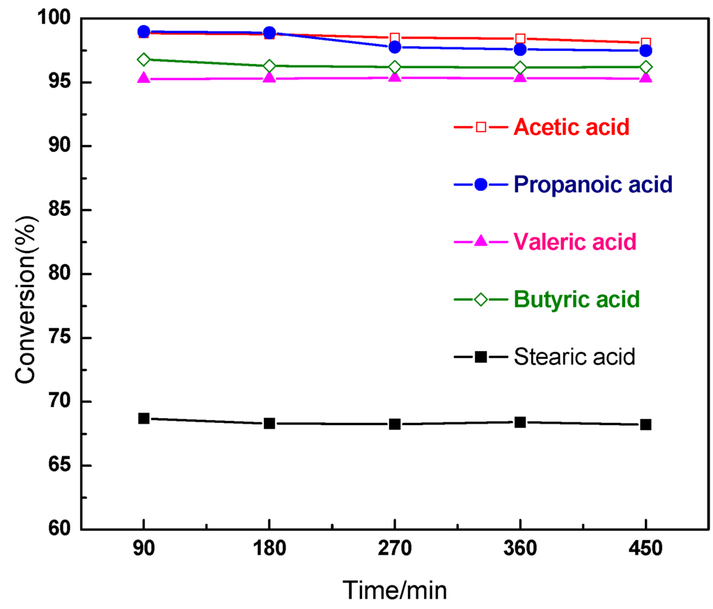 Crude oil from the co-pyrolysis of the cotton straw/PP mixture contained diverse compounds with the same functional group and different chain lengths. Thus, it was important to study the effect of the chain length of the model compound with an identical functional group on HDO on the Ni-Mo/γ-Al2O3 catalyst. Five model compounds with an identical functional group but different chain lengths were investigated in order to know the effect of chain length on HDO. Results are shown in Figure 6. It was well known that the chain length of the organic compound affected HDO on the Ni-Mo/γ-Al2O3 catalyst. The rate of HDO decreased in the following order: acetic acid > propanoic acid > butyric acid > valeric acid > stearic acid, which depended on the size of R of R-COOH. R of carboxylic acid molecules was larger; steric hindrance was more outstanding, so the rate of HDO decreased with the increase of R.