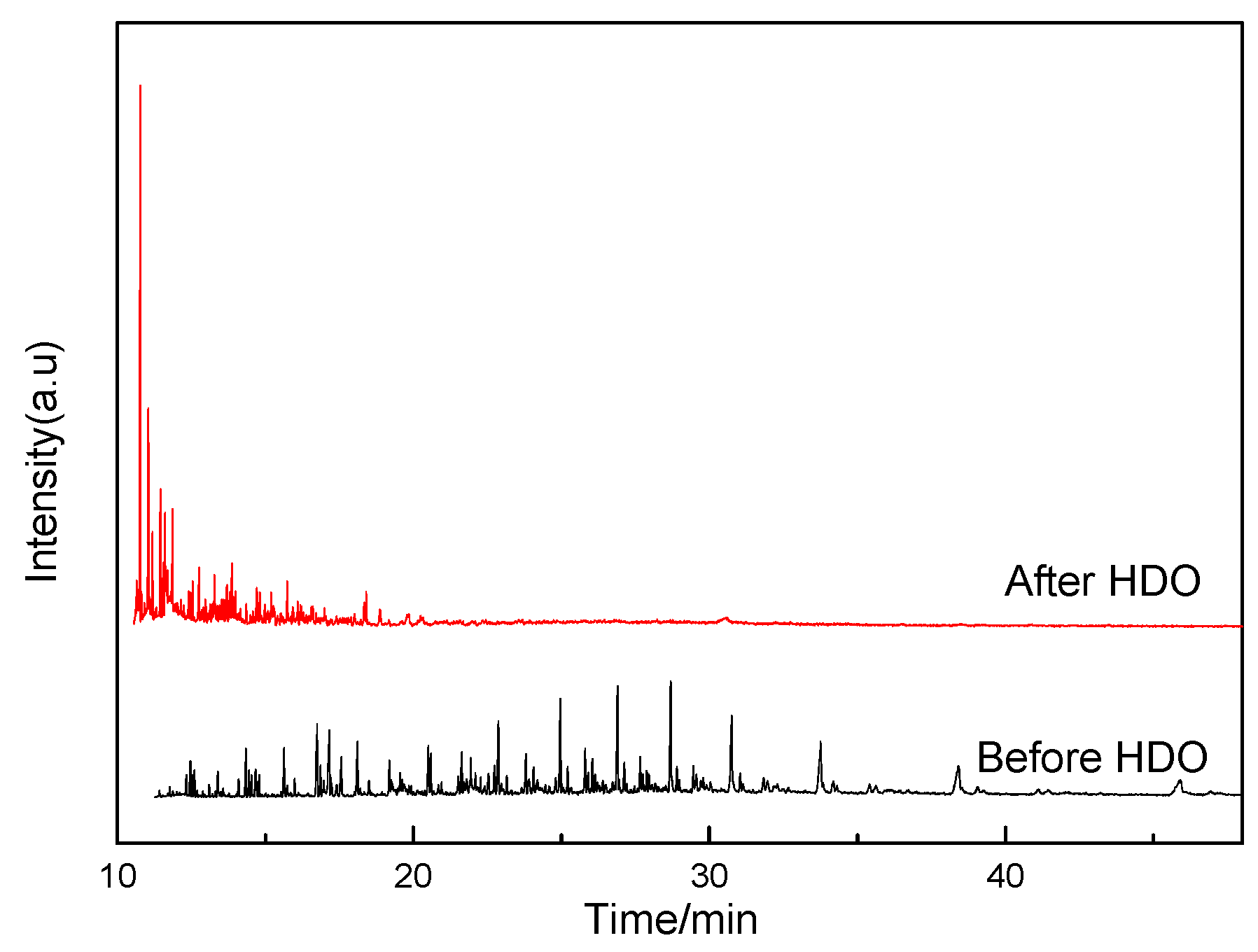 The following section was carried out with crude oil at the same conditions (270 °C and 4 MPa). Figure 7 shows the GC-MS profile of crude oil and the upgraded oil. The chromatogram of the upgraded oil showed all compositions separating out before 20 min, and many peaks corresponding to a series of n-alkanes starting at about C11 regularly appeared. The chromatogram of the crude oil showed a longer retention time than that of the upgraded oil. A summary of these results is listed in Table 3. GC-MS analysis showed that the crude oil mainly consisted of high-carbon alcohol, long-chain hydrocarbons (unsaturated and saturated), and fatty acids. Conversely, the upgraded oil mainly consisted of alkanes. Alkane (3-methyldecane) was the richest, but other alkanes from C12 to C20 also were present in the upgraded oil. A principal route to form C11 was the hydrodeoxygenation of carboxylic acid, alcohol, and aldehyde with C11, or decarbonylation and decarboxylation of the oxygenic compounds with more than C11. The composition of crude oil was different to that of the upgraded oil. Crude oil derived from the co-pyrolysis of the mixture mainly consisting of alkane, alkene, alcohol, and ester. Meanwhile, the upgraded oil mainly consisted of alkanes. Based on these results, the most of the oxygen can be removed after hydrotreating, suggesting HDO is feasible to upgrade crude oil.