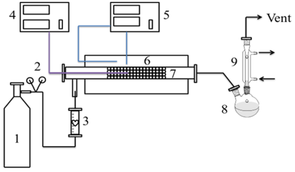 Co-pyrolysis equipment: 1, carrier gas; 2, valve; 3, flowmeter; 4, temperature monitor; 5, temperature controller; 6, furnace; 7, fixed bed reactor; 8, round-bottomed flask; 9, condenser.