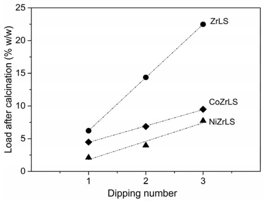 As expected, the washcoat load increased with viscosity and was observed at any dipping number. Due to the highest viscosity values, the higher loads were obtained with the pristine ZrO2 slurries which were found to reach approximately 22 wt. % after three dippings.