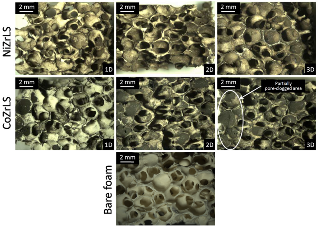 Optical images of NiZrLS (1D to3D) and CoZrLS (1D to3D) deposited on 30 PPI foams: effect of multiple dippings after flash drying. For the sake of comparison, an image of the bare foam has been added at the bottom of the image.