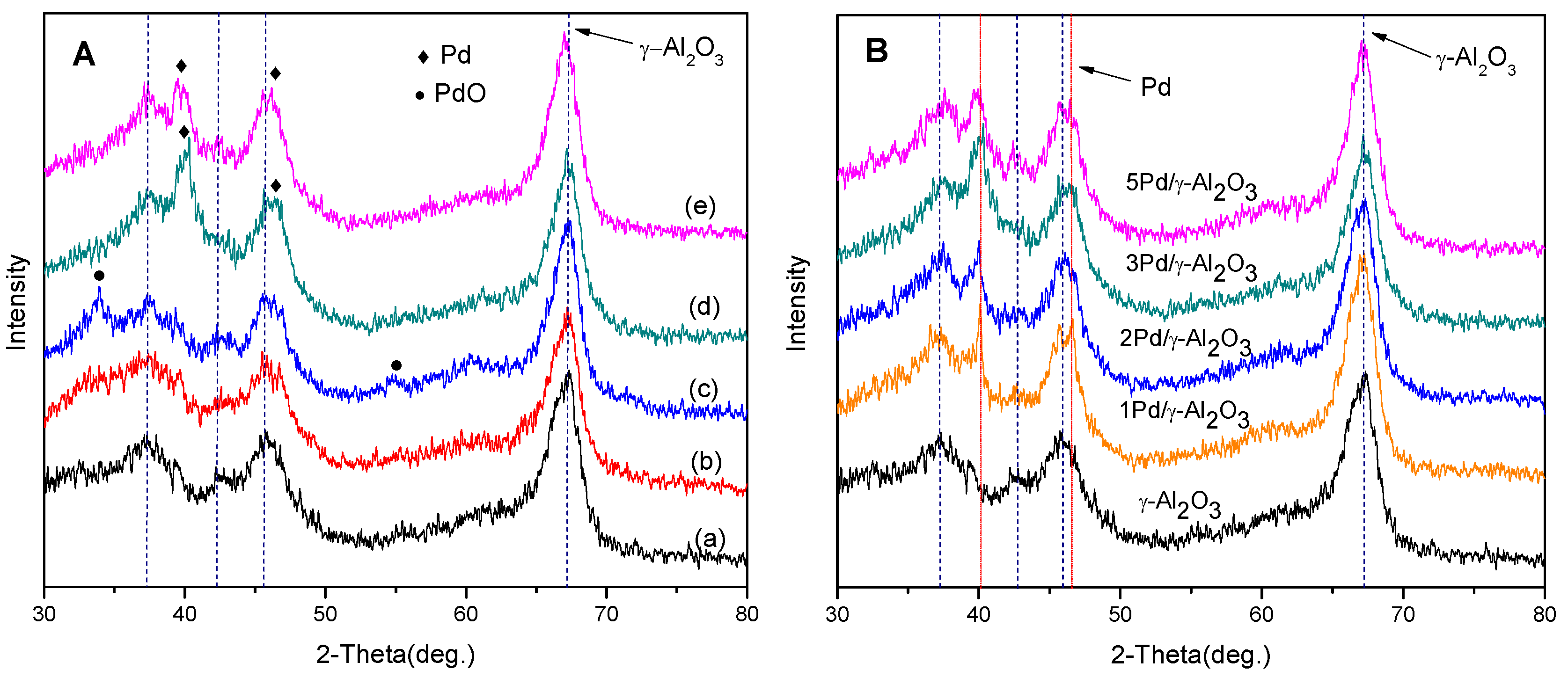 XRD patterns of the samples. (A): (a) γ-Al2O3: γ-Al2O3 support; (b) UC-3 wt. % Pd/γ-Al2O3: γ-Al2O3 support was only impregnated with aqueous liquid of PdCl2; (c) UR-3 wt. % Pd/γ-Al2O3: UC-Pd/γ-Al2O3 catalyst was calcined at 500 °C for 4 h; (d) 3 wt. % Pd/γ-Al2O3: UR-Pd/γ-Al2O3 catalyst was reduced with H2 at 450 °C for 2 h; (e) used 3 wt. % Pd/γ-Al2O3: Pd/γ-Al2O3 catalyst recycled after reaction; (B): patterns of catalysts with different Pd loading on γ-Al2O3.