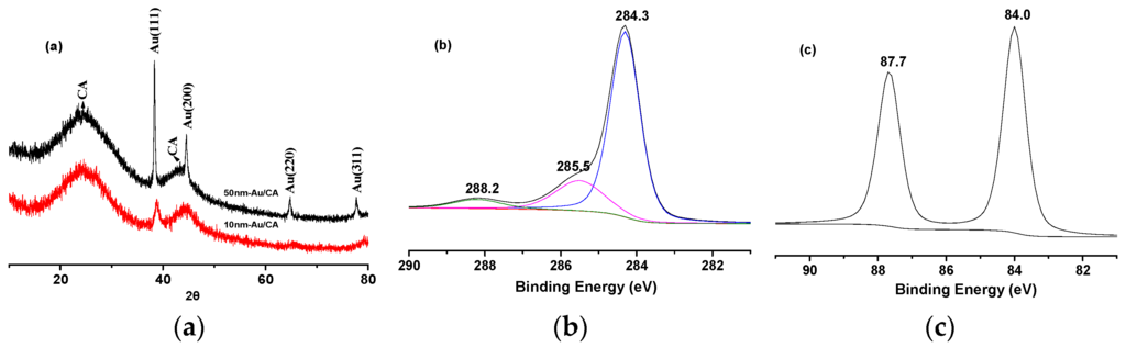 XRD patterns of the nanoparticles were obtained to investigate their phase and structure, as displayed in Figure 3a. The peaks at 22.1° and 43.2° were corresponded the typical characteristic peaks of CA [22]. Those at 38.1°, 44.4°, 64.6° and 77.6° are attributed to the {111},{200},{220} and {311} of Au, respectively. However, we can clearly see from Figure 3a, that Au/CA with the Au nanoparticle size of ~10 nm shows relatively diffuse diffractions compared to those in 50 nm-Au/CA, which are similar to the 9 nm-Au/C reported by Wang [26]. This might be ascribed to the presence of low lattice stabilized gold atoms or clusters of atoms. As we known, the atoms or atoms clusters with low lattice stability are usually considered active sites or hot spots, which afford good electrocatalytic activity [27]. According to the equation of Debye-Scherrer, a rough estimate based on the {111} peak indicates that the average size of Au nanoparticles along to the {111} lattice face is about 7.3 nm, in comparable with the result of the SEM measurement. In addition, XPS was also recorded for the as-prepared Au/CA to evaluate the chemical states of the different species. Figure 3b,c display the XPS spectra of the C1s and Au4f regions. From Figure 3b, we can see the C1s peaks centered at 284.3 eV is corresponded to elemental carbon, while those at 285.5 and 288.2 eV are assigned to the oxygen bound species C–O and C=O, respectively [28]. While the peaks at 84.0 and 87.7 eV can be attributed to the 4f7/2 and 4f5/2. It is reported that the 4f7/2 of Au0 and Au2O3 are located at 83.8 and 86.3 eV [9,28], respectively, suggesting the Au is approximately completely reduced.