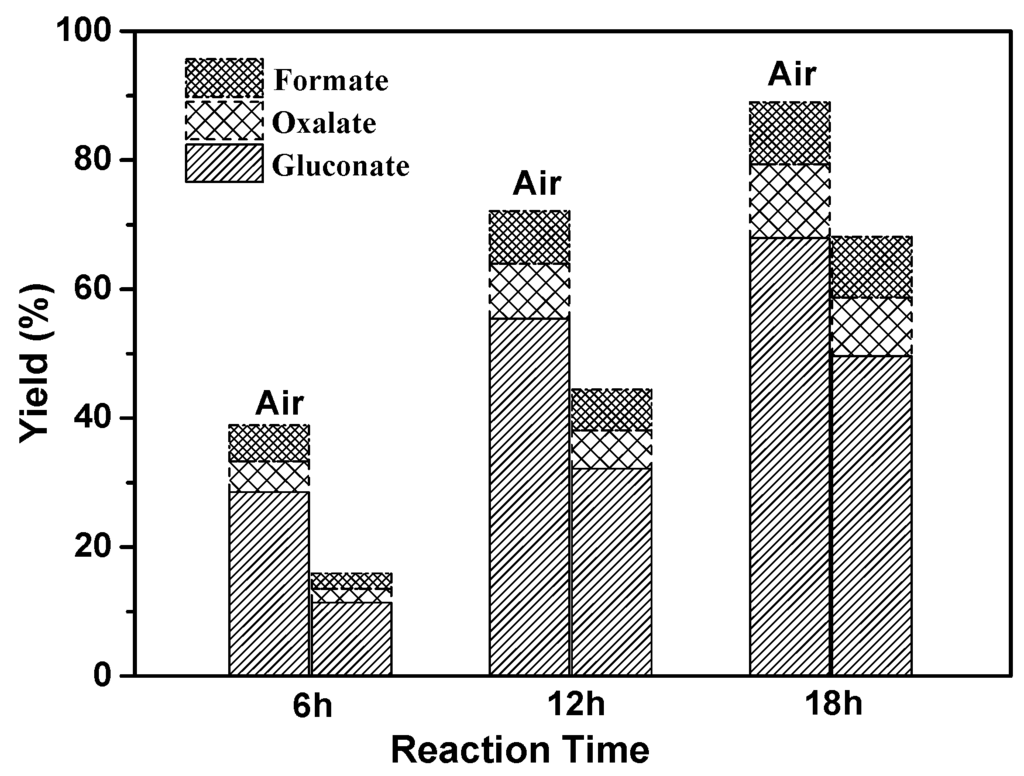 Considering that oxygen usually plays important roles in the selective oxidation of glucose to gluconic acid, particularly Au-based catalysts [4,7,28], the effect of oxygen was also studied on cellulose electrochemical oxidation by whether bubbling air into the reaction system or not. Experiment results show that the products of cellulose electrolysis are constant regardless of with or without air aeration, accompanying with a nearly unchanged products distribution. However, the aeration of air can evidently increase the reaction rate. From Figure 4, we can see, after 18 h electrolysis, the gluconic acid yield and sum acids yield are 49.6% and 68.2%, respectively, as no air aeration, while those reach 67.8% and 88.9%, respectively, with bubbling of air. In the degradation of the lignin by PbO2/Pb anode, Zhang et al. [11] considered the insufflated air enhances the conversion of O2 to superoxide anion radical (O2−) on cathode surface, leading to a higher efficiency for lignin transformation. Burke and Nugent [36] studied the electrochemistry of gold and concluded that the dissolved oxidant can induce Au to form AuOx at active sites, which often act as the mediators for oxidation reaction. While the monomeric Au(III) hydroxyl complexes of the form Au(OH)63− is proposed by Doyle and Lyons [37]. Moreover, the increment of oxygen can also effectively increase the O2 adsorption on Au surfaces by forming linear O–Au–O structure, contributing to the high catalysis efficiency of gold [38,39]. Hence, the aeration of air is deduced to increase the active Au-oxide species resulting in a better transformation of cellulose. More importantly, the aeration of air can accelerate the cathode reaction. It is known that, in alkaline media, H2O and dissolved oxygen are the possible reductions which can be reduced at cathode. As H2O acts as the reductant, it reacts via the hydrogen evolution reaction: