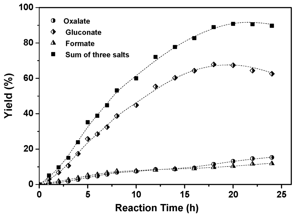 As for formate, it displays an inconspicuous increase with the decomposition of gluconate, deduced likely to be the direct oxidation of glucose via α-scission [24,43]. In addition, the total yield of gluconate, oxalate and formate is also calculated and shown in Figure 5. Surprisingly, the sum yields were very high with the value of ~91% at the reaction time of 22 h, implying the high conversion efficiency of cellulose on Au/CA anode in alkaline condition.