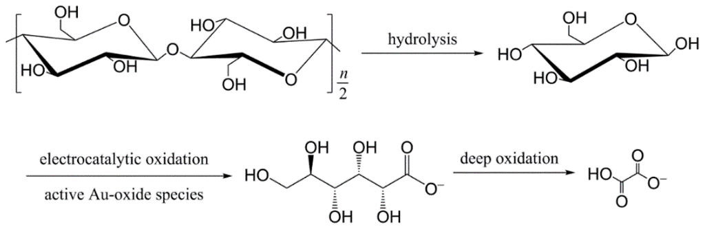 In this work, the properties of Au/CA electrocatalytic anode and the reaction condition were carefully investigated for exploring the high selective conversion efficiency of cellulose. Moreover, the main intermediates were also monitored with the variation of reaction time, which helps to understand the probable mechanism for the electrocatalytic oxidation of cellulose in alkaline condition.