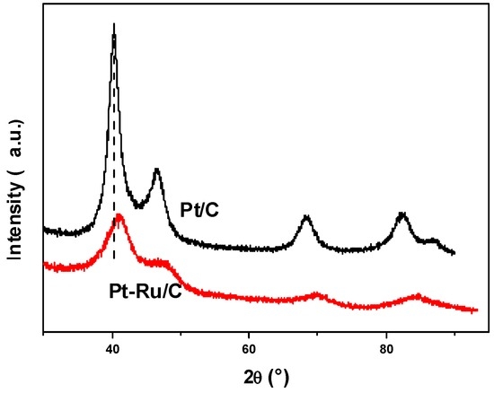 X-ray diffraction (XRD) patterns of the Pt/C and Pt–Ru/C catalysts.