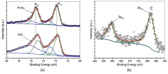 Specifically, in comparison with the 4f peak positions of the commercial Pt/C catalyst, the 4f BEs of Pt in Pt–Ru/C clearly shifts to higher values, as indicated by Figure 3a, illustrating that the electronic structure of Pt has been modified by alloying with Ru. Besides particle size, the electronic interactions between the Pt and Ru atoms in Pt–Ru/C, as well as atomic composition, play an important role in determining the BE position for Pt 4f7/2 [17,18], as reported by Hu et al. [19]. The positive shift in Pt 4f BE means the decrease of electron density around the Pt atoms, which would be helpful in improving the adsorption of oxygen on the Pt sites, and hence promote the ORR [17,18,20].