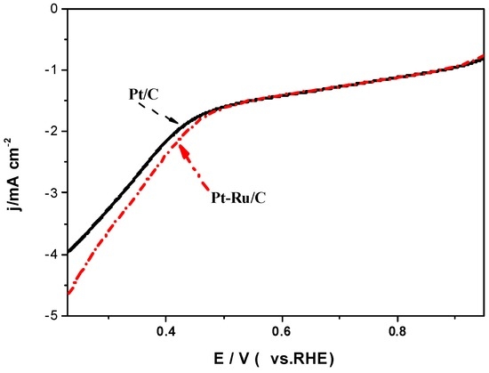 Linear sweep voltammetries (LSVs) of the Pt/C and Pt–Ru/C catalysts in the O2-saturated pH-neutral electrolyte.