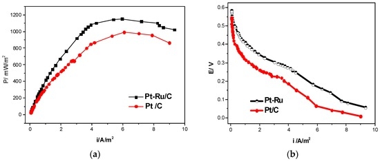 To further demonstrate the efficiency of different catalysts towards the ORR in a neutral solution, the room-temperature performances of the MFCs containing Pt/C and Pt–Ru/C as cathode catalysts were assessed. Figure 5 shows the power densities and polarization curves of the MFCs with different cathodes. The results demonstrate that the maximum power density of the MFCs (Figure 5a) with a lower loading of Pt (Pt–Ru/C) as the cathode catalyst was 1139 mW·m−2, which was slightly higher than the corresponding value for Pt/C (985 mW·m−2). The maximum power densities generated in the MFCs are in a middle level compared with results in previous studies [4,24,25,26,27]. This enhancement in power density may be attributed to the synergistic effect of the addition of Ru (which improves the catalytic activity towards the ORR). A similar result was reported by Zardari et al. under alkaline conditions [3]. The polarization curves (Figure 5b) were obtained by determining the change in voltage as a function of current density. The electrode potential decreased with the increase in the current density. The non-linear polarization curves observed for the MFCs indicate that the decrease in the voltage was caused mainly by ohmic activation followed by the diffusion losses [28]. As observed from Figure 5b, the open-circuit potential of Pt–Ru/C (0.60 V) was 0.05 V higher than that of the Pt/C (0.55 V) catalyst. In contrast, the overpotential of the Pt–Ru/C catalyst was lower than that of the Pt catalyst. In addition, the Coulombic efficiency of the MFCs with Pt–Ru/C as cathode catalyst, calculated according to Equation (3), was 36.23% higher than that of the Pt/C catalyst, which exhibited a value of 32.39%.