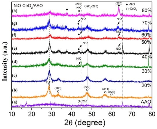 X-ray diffraction (XRD) patterns of the NiO-CeO2/AAO catalysts: (a) Anodic aluminum oxide (AAO) support; (b) 20% NiO-CeO2/AAO; (c) 30% NiO-CeO2/AAO; (d) 40% NiO-CeO2/AAO; (e) 50% NiO-CeO2/AAO; (f) 60% NiO-CeO2/AAO; (g) 70% NiO-CeO2/AAO; (h) 80% NiO-CeO2/AAO.