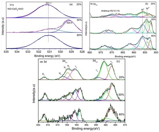 (a) O 1s; (b) Ni 2p; (c) Ce 3d XPS (X-ray photoelectron spectroscopy) spectra of 20%, 50% and 80% NiO-CeO2/AAO catalysts.