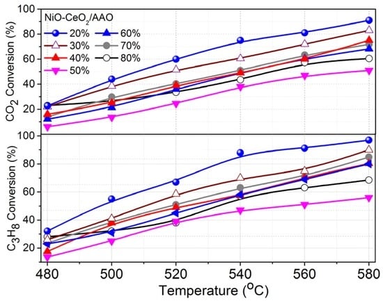 The performance of the catalysts with different Ni and Ce loadings were examined in terms of C3H8 and CO2 conversions at various temperatures up to 580 °C, which is illustrated in Figure 5. The obtained results showed that both C3H8 and CO2 conversions were the highest with the 20% NiO-CeO2/AAO catalyst. At a lower reaction temperature of 500 °C, 20% and 30% NiO-CeO2/AAO catalyst exhibited 55% and 40% C3H8 conversion, and 45% and 40% CO2 conversion, respectively, while at 580 °C the same catalysts exhibited 97% and 90% C3H8 conversion and 90% and 80% CO2 conversion, respectively. As expected from the strong endothermic reforming reaction (∆H0298 K = 644.8 kJ·mol−1), the catalysts explored in this work showed their best catalytic activity at 580 °C. Increasing the nickel concentration from 20% to 80% tended to decrease the propane and CO2 conversion due to the lower nickel dispersion at higher nickel loadings. Also, it is clear that the conversion efficiency of CO2 was lower than that of C3H8 for all the catalysts, which can be explained by the additional propane consumption caused by its cracking into carbon. The C3H8 cracking into carbon and H2 consumed more C3H8 than the stoichiometric value. Meanwhile, the 50% NiO-CeO2/AAO catalyst was less active for propane reforming when compared with 40% and 60% catalyst. This might be due to the low BET surface area and large crystal size (23 nm) of ceria (Table 1).