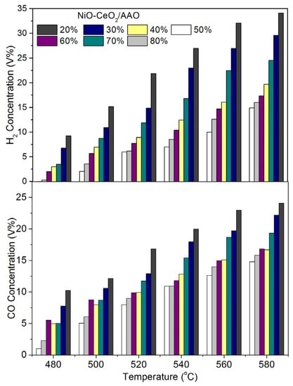 The product concentrations of H2 and CO obtained during the DRP with various NiO-CeO2/AAO catalysts are represented in Figure 6, where it can be seen that the CO and H2 concentrations increased when gradually increasing the reaction temperature. The H2 concentration was higher than that of CO, as the temperature increased, because of the C3H8 cracking. From the effects of temperature on the conversion and product concentrations, it can be concluded that increasing the temperature is beneficial for the improvement in the conversion and the generation of syngas. Under the tested conditions, the adequate temperature appears to be 580 °C for the 20% NiO-CeO2/AAO. The H2/CO ratios acquired with the NiO-CeO2/AAO catalysts are shown in Figure S2 as a function of reaction temperature. At temperatures in the range of 480–580 °C, the 20% and 30% NiO-CeO2/AAO catalysts showed somewhat higher H2/CO ratio than the other ones. The enhanced catalytic activity of the 20% and 30% NiO-CeO2/AAO catalysts may be due to the ultrafine NiO/CeO2 nanoparticles or nanorods with high dispersion over the AAO support. It has been reported that the stability and dispersion of metal is significantly improved by the metal-oxygen species formed on the surface of CeO2 [37]. It has also been well recognized that the state of metallic Ni phases such as reduced and dispersed phases as well as the redox ability of CeO2 has a strong influence on the catalytic activity of CeO2-based Ni catalyst [38].