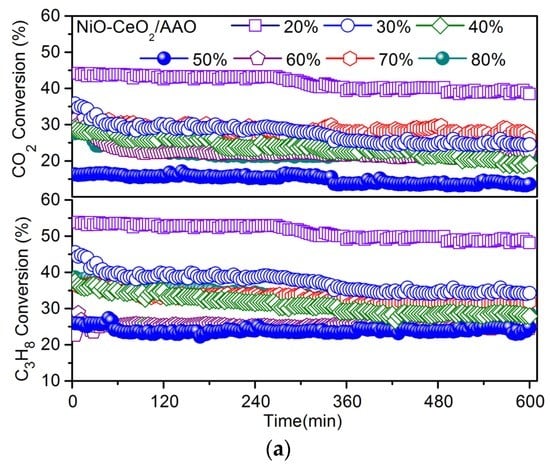 The catalytic stability of the NiO-CeO2/AAO catalysts was examined over the period of 55 h at 500 °C, which is shown in Figure 7. It appears that the 20% NiO-CeO2/AAO showed higher and more stable catalytic activity during the DRP, compared to the other catalysts. For instance, the C3H8 and CO2 conversions over the 20% NiO-CeO2/AAO catalyst was 54% and 43% at the start of the reaction, which decreased to 49% and 39%, respectively, after 55 h of the reaction. These small decreases in the C3H8 and CO2 conversions confirm its higher stability over the other catalysts. The higher activity and long-term stability of the 20% NiO-CeO2/AAO are credited to its features such as high thermal stability, redox behavior, reducibility and surface acidity [39]. The stability of the catalysts was also examined in terms of H2 and CO concentrations under the same conditions (Figure 7b). Decreases in the C3H8 and CO2 conversion efficiencies as well as in the H2 and CO concentrations with elapsed time were observed for the catalysts. For the 20% NiO-CeO2/AAO catalyst, the H2 and CO concentrations slightly increased in the early stage, probably because some further reduction of the metal oxide species occurred. As presented in Figure 7a,b, the catalytic stability did not decrease much during the 10-h reforming reaction on stream.