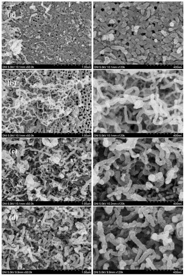FE-SEM images of the spent catalysts. (a) 20%; (b) 30%; (c) 50%; (d) 80% NiO-CeO2/AAO with two magnifications (left: 1 µm; right: 400 nm scale).