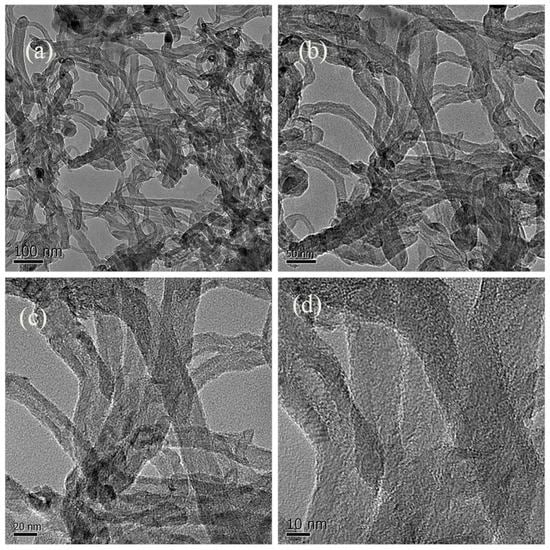 TEM (transmission electron microscopy) images of the 20% NiO-CeO2/AAO catalyst after the DRP with different magnifications: (a) 100 nm; (b) 50 nm; (c) 20 nm; (d) 10 nm.