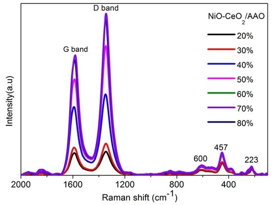 The Raman spectra of the spent catalysts (20%–80% NiO-CeO2/AAO) are presented in Figure 10. It is noticed that all the used catalysts invariably showed two distinct bands, one located at 1590–1600 cm−1 and the other at 1380–1400 cm−1. The former and the latter are ascribed to the amorphous carbon and the graphitic carbon, respectively [41,42,43]. For the 70% NiO-CeO2/AAO catalyst, the intensity of the D band is stronger than that of the G band, implying that amorphous carbon is predominant. The relative ratio of the D band intensity to the G band intensity was 1.37 for the spent 80% NiO-CeO2/AAO catalyst, and 1.06 for the spent 20% NiO-CeO2/AAO catalyst. These results demonstrate that the carbon deposited on the 20% NiO-CeO2/AAO catalyst was highly graphitized, which agrees well with the TEM images. In this figure, a few peaks corresponding to CeO2 can also be observed for all the catalysts, indicating that the formation of carbon is less when ceria loading on the AAO support is higher and there is no carbon deposited on CeO2.