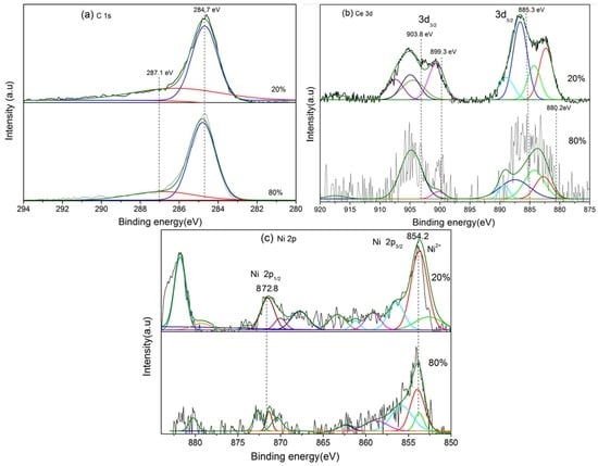 The catalyst deactivation during the reforming reaction is mainly caused by two reasons such as carbon deposition and metal sintering. The metal sintering leads to aggregation of metal particles during the reaction and causes catalyst deactivation. To date, it is well known that the deposition of carbon on the surface is one of the main reasons for catalyst deactivation. For more information on the carbon species formed during reforming reactions, we monitored the XPS scanning in the C 1s region after the reforming reaction on the 20% and 80% NiO-CeO2/AAO catalysts. The C 1s spectra in Figure 11a showed a narrow band at 284.7 eV and a shoulder peak at 287.12 eV, which reveals the presence of two types of carbonaceous species, i.e., carbonaceous layer on the surface of the grains and filaments [44,45]. These two types of carbon species may be detected at a binding energy of 284.5 eV. Also, the metal sintering is not ignorable, though the effect is limited. Here, the observed long-term stability of NiO-CeO2/AAO catalyst further reveals the limited sintering of Ni and Ce particles and good coking resistance as well. So as to understand more about it, we have compared the oxidation state of Ni and Ce before and after the reforming reaction. The XPS spectra of Ce (3d) and Ni (2p) regions for the 20% and 80% NiO-CeO2/AAO are shown in Figure 11b,c. After the reaction, the intensity of Ce3+ band was observed to decrease, which might have been due to the sintering and some Ni clusters covered by the AAO support. Here, neither sintering nor diffusion of ceria into the bulk should be put aside either. A small reduction of Ce4+ to Ce3+ can be best sensed as the small increase of the 903.9 eV and 885.3 eV intensity and also the weaker 899.3 eV and 880.2 eV components, which are the characteristics of Ce3+ [46,47]. After an elaborate analysis of the Ce 3d spectra, it can be concluded that the reduction of Ce is limited during DRP reactions. The Ni 2p spectra of the 20% and 80% NiO-CeO2/AAO catalysts are shown in Figure 11c, where the observed binding energy values at 854.2 eV (Ni 2p3/2) and 872.8 eV (Ni 2p1/2) further confirmed the presence of Ni2+ in the catalyst. In addition, the presence of metallic Ni0 and Ni2+ indicated the reduction of Ni2+ to Ni under an inert atmosphere.