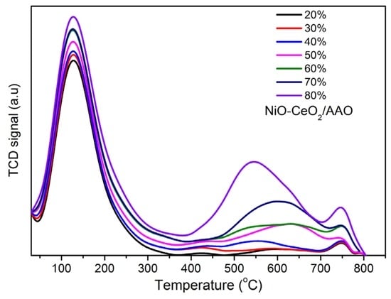 Figure S1 shows the temperature programmed reduction (TPR) curves for the NiO-CeO2/AAO catalysts with different Ni contents. In all cases, two reduction peaks, the first one at temperatures in the range of 208–240 °C and the second one at temperatures from 432 to 496 °C, depending on the Ni content, were observed. The first peak is due to the reduction of mildly interactive NiO with CeO2 on the AAO support [30,31,32,33]. The second one was attributed to the reduction of NiO species that was strongly interactive with CeO2. The second reduction peak for the 20% NiO-CeO2/AAO was located at around 432 °C, while that of the 80% NiO-CeO2/AAO shifted to 496 °C, revealing a stronger interaction of NiO with CeO2 on the AAO support [31,34]. Namely, the reduction of NiO (to Ni) that is strongly bound to the CeO2 requires a higher temperature.