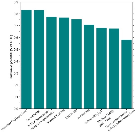 | Co0.03@CoO-N-doped graphene carbon shells-800 | Introduction of metal precursor (cobalt nitrate) to sucrose and urea followed by pyrolyzing and 0.1 M KOH, oxygen saturated, 10 mV·s−1, 1600 rpm, (0.1 M KOH + 0.5 M MeOH) | Jd = 4.1 mA·cm−2 (Inactive in MeOH presence) E1/2 = 0.81 V vs. RHE | [47] |