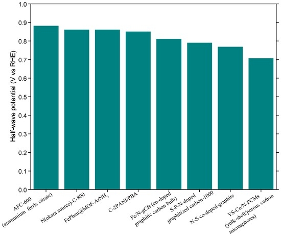 | N(okara source)-C-800 | Nitrogen-doped carbon by okara treatment using also FeCl3 & 0.1 M KOH, oxygen saturated, 5 mV·s−1, 1600 rpm | Jd = 4.0 mA·cm−2 E1/2 = 0.86 V vs. RHE | [75] |