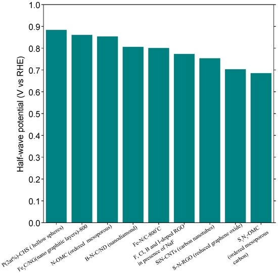 | S-P-N-doped graphitized carbon-1000 | Soya (plant) as carbon source-graphitized product as support & 0.1 M KOH, oxygen saturated, 5 mV·s−1, 1600 rpm (0.1 M KOH + 1.25 M MeOH) | Jd = 3.7 mA·cm−2 (MeOH tolerant) E1/2 = 0.79 V vs. RHE | [78] |