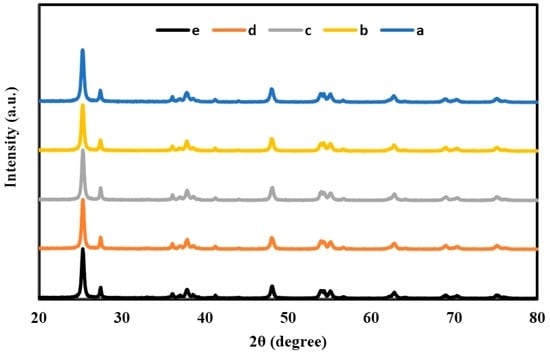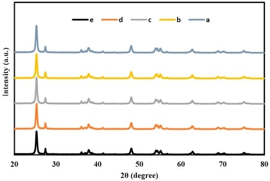 X-ray diffraction pattern: (a) TiO2; (b) 0.2 wt % Ni2+/TiO2; (c) 0.4 wt % Ni2+/TiO2; (d) 0.6 wt % Ni2+/TiO2; and (e) 0.8 wt % Ni2+/TiO2.