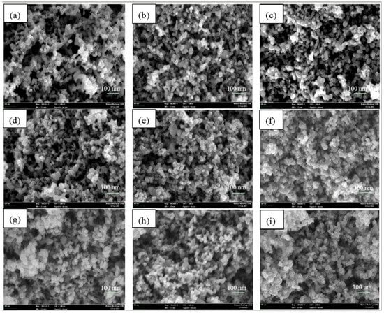 Field emission scanning electron microscopy images: (a) TiO2; (b) 0.6 wt % Er3+/TiO2; (c) 1.2 wt % Er3+/TiO2; (d) 1.8 wt % Er3+/TiO2; (e) 2.4 wt % Er3+/TiO2; (f) 0.2 wt % Ni2+/TiO2; (g) 0.4 wt % Ni2+/TiO2; (h) 0.6 wt % Ni2+/TiO2; and (i) 0.8 wt % Ni2+/TiO2.