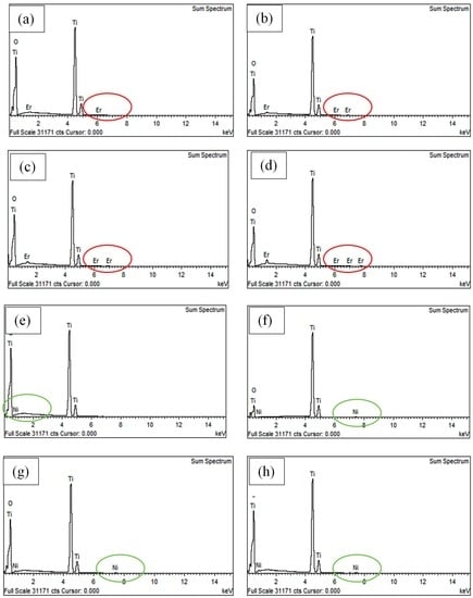 Energy dispersive X-ray spectra: (a) 0.6 wt % Er3+/TiO2; (b) 1.2 wt % Er3+/TiO2; (c) 1.8 wt % Er3+/TiO2; (d) 2.4 wt % Er3+/TiO2; (e) 0.2 wt % Ni2+/TiO2; (f) 0.4 wt % Ni2+/TiO2; (g) 0.6 wt % Ni2+/TiO2; and (h) 0.8 wt % Ni2+/TiO2. Red circle: Er3+; green circle: Ni2+.