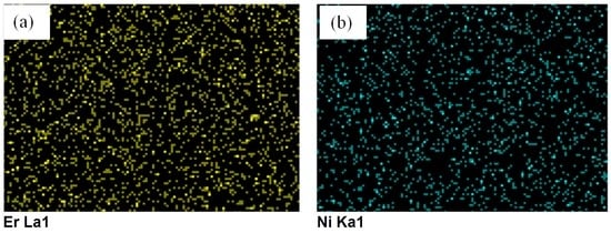 EDX analysis was conducted on the Er3+/TiO2 and Ni2+/TiO2 samples to investigate the presence of Er and Ni on the TiO2 surface. The results of the EDX spectra are shown in Figure 4 and show that the Er and Ni are present in each of their respective samples. Additionally, the EDX spectral data provided the wt % of the Er and Ni content in the samples, and the results are summarized in Table 4. These results indicate that there is good agreement between the calculated and actual content of Er and Ni. Metal mapping tests were conducted to investigate the dispersion of Er and Ni on the TiO2 surface. The results are shown in Figure 5 and reveal a good distribution of Er and Ni on the TiO2 NPs in each of the prepared samples.