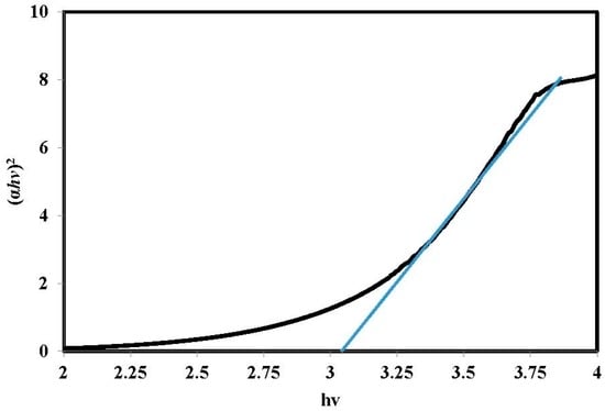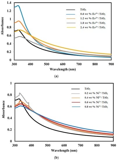 The absorbance spectra for all the prepared samples (0.6, 1.2, 1.8, and 2.4 wt %) and (0.2, 0.4, 0.6, and 0.8 wt %) of Er3+/TiO2 and Ni2+/TiO2, respectively, were recorded at room temperature and are shown in Figure 6. The maximum absorption was observed at 320 nm. The direct band gap (Eg) values of TiO2, Er3+/TiO2 and Ni2+/TiO2 NPs were determined using the following direct transition equation (Equation (2)):
