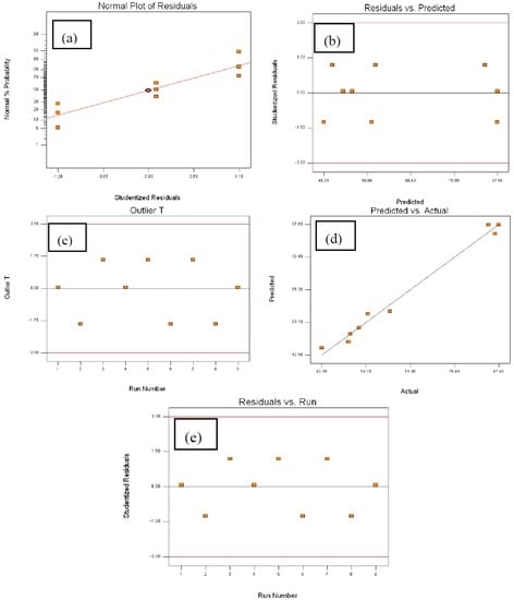 Diagnostic plots of the photocatalytic degradation efficiency percentage (DE%) for the optimization process. (a) Studentized residual; (b) Residual vs. predicted; (c) Outlier; (d) Actual vs. predicted; and (e) Residual vs. Run.