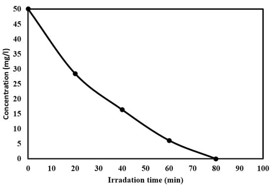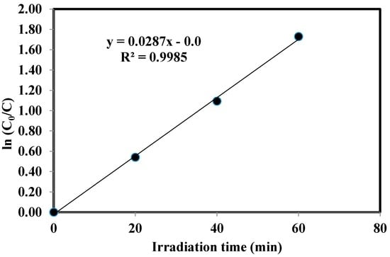 The experimental results of the photocatalytic degradation of chloroxylenol are shown in Figure 9. The reported results of the photocatalytic degradation of chloroxylenol show that the degradation rates of the photocatalytic oxidation using TiO2 NPs could be fit with the first-order kinetic model []. Figure 10 shows the plot of ln(C0/C) vs. the irradiation time for the degradation of chloroxylenol. The linearity of the plot suggests that the photodegradation reaction approximately follows the pseudo-first order kinetics with K = 0.0287 min−1.