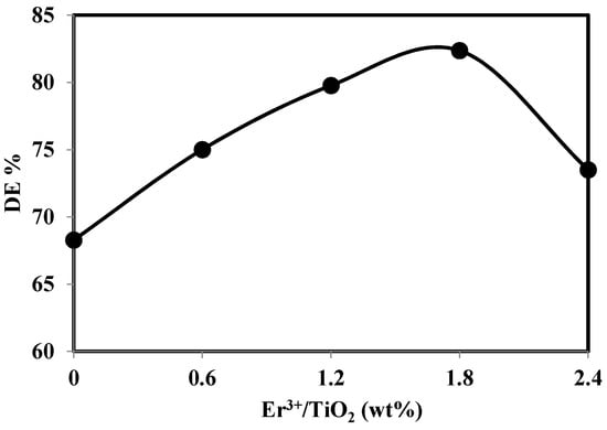 In general, the DE% increased with the increasing concentration of both Er3+ and Ni2+ relative to the intrinsic TiO2. The DE% increased up to an optimal concentration for both Er3+ and Ni2+ over intrinsic TiO2 at 1.8 and 0.60 wt %, respectively. This result is attributed to the decrease in the band gap because of the shifting absorbance to the visible region. The band gaps of Er3+ and Ni2+, compared with intrinsic TiO2, at 1.8 and 0.60 wt % were found to be 2.63 and 2.47 eV, respectively. These results were compared to intrinsic TiO2 at 3.13 eV in Table 5. This shifting is attributed to the incorporation of Er3+ and Ni2+ into the surface of the TiO2 nanoparticles []. After the optimal doping concentrations of Er3+ and Ni2+ for TiO2, a decrease in the DE% was observed, which is attributed to the excess Er3+ and Ni2+ ions working as a recombination center within the degradation process []. However, the electron-hole recombination is faster in the presence of Er3+ and Ni2+ ions due to the unstable Er4+ and Ni3+ ions that can easily transfer electrons to the oxygen molecules [].