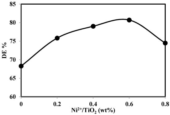 To investigate the effects of the impregnation of TiO2 NPs with Er3+ and Ni2+ on the DE%, experiments were performed using the optimal conditions shown in Table 8 on a semi-cloudy day (solar radiation 600 W/m2) with a constant reaction time of 60 min using different wt % of Er3+/iO2 and Ni2+/TiO2 NPs. The results for the DE% using Er3+/TiO2 and Ni2+/TiO2 NPs are shown in Figure 11 and Figure 12, respectively. Figure 11 shows the maximum DE% of 82.38% obtained at a 1.8 wt % of Er3+/TiO2 provides a 14.10% increase compared with that of the intrinsic TiO2 NPs at 68.28%. The maximum DE% of 80.70% obtained at a 0.6 wt % of Ni2+/TiO2 showed an increase of 12.42% compared with that intrinsic TiO2 NPs, as shown in Figure 12.