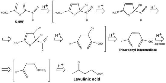 Antal et al. proposed that 5-HMF is produced from fructose via cyclic intermediates [19]. Recent studies have further confirmed that 5-HMF originates from the acid-catalyzed dehydration of C6-sugars in the furanose form [20,21]. The first step is the formation of 5-HMF by a triple dehydration step. 5-HMF is an unstable molecule and easily condenses, together with sugars and sugar degradation products, into black insoluble charred materials often called “humins” [22,23,24,25]. In an extensive review on the 5-HMF formation, Van Putten et al. have demonstrated that the temperature and reaction conditions required for the dehydration of glucose and other aldoses are significantly more severe than those for fructose. This evidence is tentatively explained by the need for glucose to first isomerize to fructose via the enediol form [26]. This isomerization is a Brønsted-base or Lewis-acid catalyzed reaction and thus proceeds very slowly under the strong Brønsted acid conditions generally used for the subsequent dehydration of the fructose. The harsher reaction conditions adopted for aldoses cause the formation of higher amounts of humins. The rehydration of 5-HMF with two molecules of water leads to LA and formic acid [27]. Regarding the thermodynamics of the process, the dehydration of fructose to 5-HMF is highly endothermic (by up to 92.0 kJ/mol), the glucose to fructose isomerization is very weakly endothermic (8.4 kJ/mol), whereas the other steps, including additional water elimination and rehydration to form LA, are exothermic (from 16.7 to 133.9 kJ/mol) [28]. Elevated temperatures and aqueous reaction environment make the dehydration reaction steps thermodynamically more favorable. A proposed rehydration mechanism of 5-HMF into LA in acid environment is reported in Figure 2 [29].