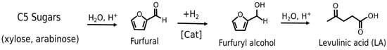 A completely different but very interesting route for the synthesis of LA is the direct conversion of furfuryl alcohol, which is obtained by furfural hydrogenation [37]. This third alternative pathway is depicted in Figure 4.