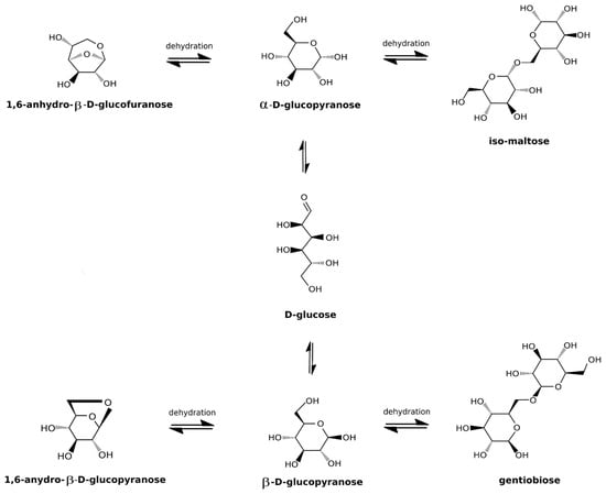 In acidic solutions, the acyclic form of d-glucose (1) exists in equilibrium with its anomeric forms, i.e., α-d-glucopyranose and β-d-glucopyranose. The anomeric forms may be involved in a number of reactions leading to reversion products [68]. Intra-molecular condensation reactions produce anhydro sugars, mainly levoglucosan and 1,6-anhydro-β-d-glucofuranose. Inter-molecular condensation reactions between two glucose units will give disaccharides such as isomaltose and gentiobiose. Several investigators have also found and isolated other type of disaccharides, i.e., (1-2)-linked and (1-3)-linked ones and/or anhydro sugars, giving low concentration of the reversion products [69]. LA can be reversibly dehydrated to α-angelica lactone (3-penten-4-olide) also in the absence of acid catalyst. In the presence of acid catalysts, under heating, α-angelica lactone can isomerize, thus forming a mixture containing also β-angelica lactone (3-penten-4-olide) and γ-angelica lactone (4-penten-4-olide). Besides, the angelica lactones can also dimerize giving heavier by-products [70].