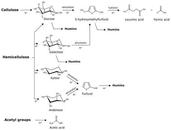 When raw lignocellulosic biomass is employed, acid depolymerization of hemicellulose fraction releases pentoses (xylose and arabinose), which are converted to furfural, while from the different hexoses (glucose, galactose and mannose) of the cellulose fraction, levulinic acid is formed (Figure 3) [36]. In this case, the solid by-product contains humins and also lignin residues.