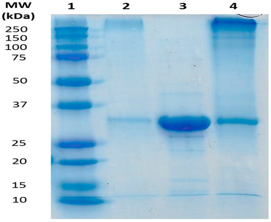 Sodium dodecyl sulfate polyacrylamide gel electrophoresis (SDS-PAGE) analysis of xylanase 10A. lane 1, molecular weight markers; lane 2, analysis of the pellet obtained after centrifugation of the reaction medium after the light induced oxidation reaction; lane 3, xylanase 10A purified before the reaction; lane 4, supernatant obtained after centrifugation of the reaction medium after catalysis.