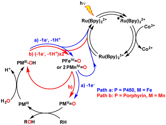 Reaction pathways for the two-electron oxidation of an organic substrate by light-driven activation of a catalyst: Path (a) two-electron oxidation of an iron-bound water molecule into high-valent P-450-iron-oxo species by [RuIII(bpy)3]3+, generated by quenching of the excited state of [RuII(bpy)3]2+ by an irreversible electron acceptor ([CoIII(NH3)5Cl]2+) [14]; Path (b) one-electron oxidation of an MnIII-OH complex into a porphyrin-MnIV-oxo species by [RuIII(bpy)3]3+, followed by the disproportionation of the MnIV-oxo species into MnIII and MnV=O [15,16].