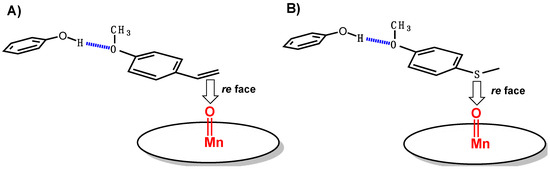 Selective orientation of (A) p-methoxystyrene and (B) p-methoxythioanisole towards the putative porphyrin-Mn-oxo oxidizing species using 1-Mn-Xln10A as catalyst