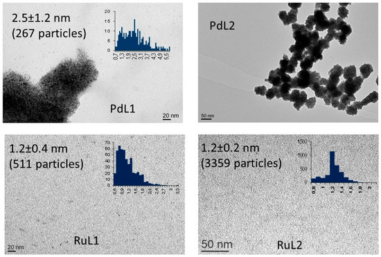 TEM (Transmission Electron Microscopy) images of PdL1 and PdL2 (top); and RuL1 and RuL2 (bottom); insets represent the corresponding size distribution diagrams.