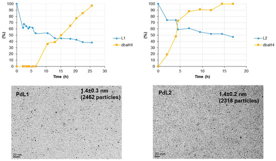Graphical representations of the data corresponding to the consumption of ligand and decomposition of Pd precursor from the 1H NMR monitoring of the formation PdNPs with L1 and L2 (top); TEM images of PdL1 and PdL2 after total consumption of [Pd2(dba)3] (bottom).